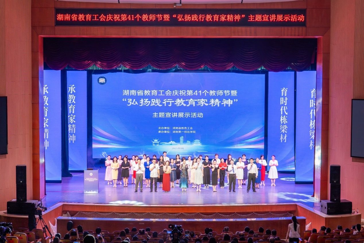 在浩瀚师恩中聆听教育家精神的时代回响!9月5日上午,由湖南省教育工会主办的庆祝第41个教师节暨“弘扬践行教育家精神”主题宣讲展示活动在我校举行。
